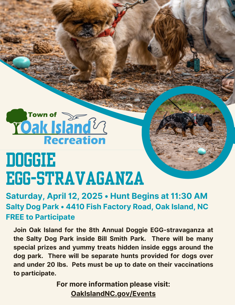 Join Oak Island for the 8th Annual Doggie EGG-stravaganza at the Salty Dog Park inside Bill Smith Park. There will be many special prizes and yummy treats hidden inside eggs around the dog park. There will be separate hunts provided for dogs over and under 20 lbs. Pets must be up to date on their vaccinations to participate.