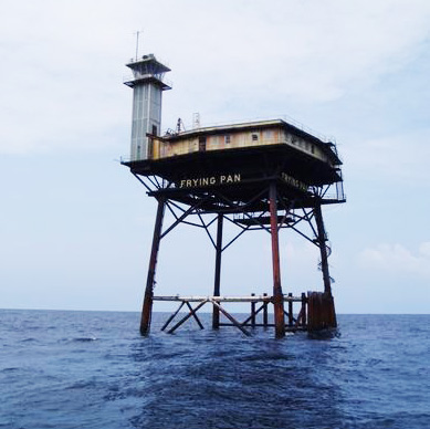 The Frying Pan Shoals Light Tower is a decommissioned lighthouse located approximately 25 miles (40 km) southeast of Oak Island, North Carolina. The light tower is a steel oil drilling platform, known as a “Texas Tower” on top of four steel legs that has been modified to be used as a lighthouse. The 80-foot (24 m) light tower marks the shoals at the confluence of the Cape Fear River and the Atlantic Ocean. The platform consists of two floors. The subfloor is a living area of approximately 5,000 square feet (460 m2) that includes five bedrooms, kitchen, office, storage area, recreation area and toilet facilities.
