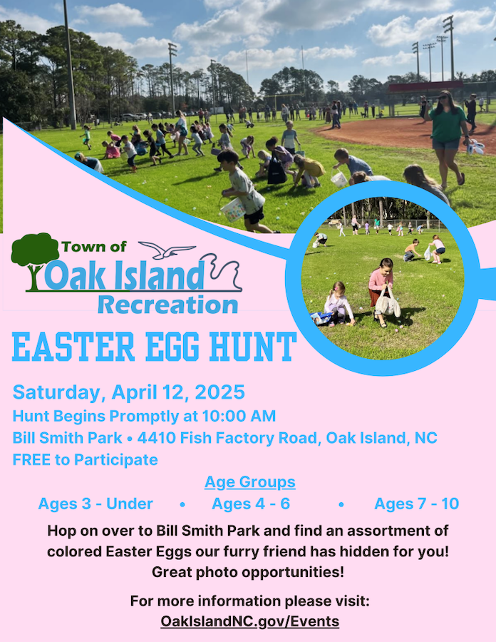 The Annual Oak Island Egg Hunt will take place on Saturday, April 12, 2025 at 10 am. Hop on over to Bill Smith Park and find an assortment of colored Easter Eggs our Furry Friend has hidden for you this year! Great Photo Opportunities – Bring a camera and snag some fantastic photos of the goodies that are hopping down the trail this year!. For more information please visit: www.OakIslandNC.gov/EVENTS or by calling 910-278-4747