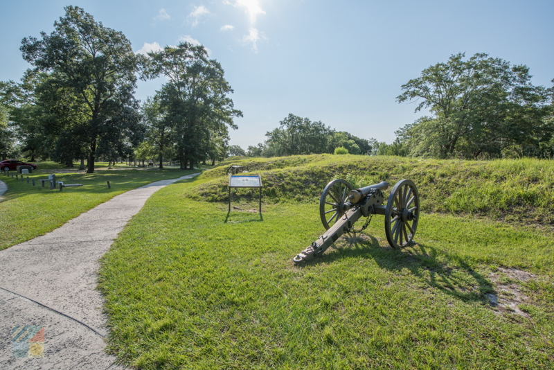 The Confederate army used manual labor to construct the large sand fortification originally called Fort St. Philip’s. There were two batteries, each with five cannons overlooking the shipping channel and providing protection to blockade runners.