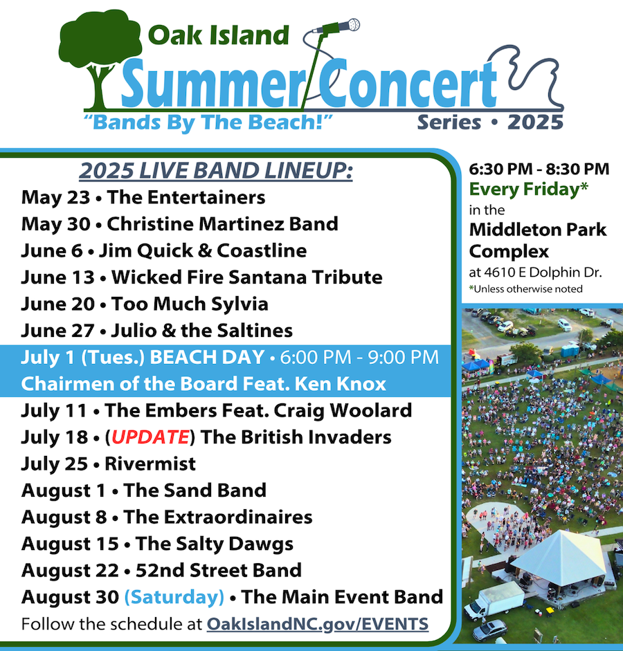 For 15 weeks on Fridays from 6:30 pm to 8:30 pm at the Middleton Park Ampitheater, we turn the amps up to “11” and come together for the annual Town of Oak Island Summer Concert Series.